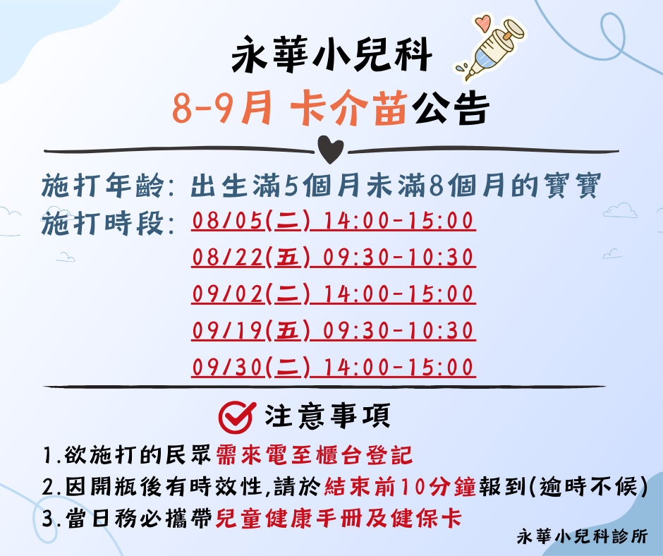 永華小兒科8-9月卡介苗公告